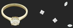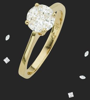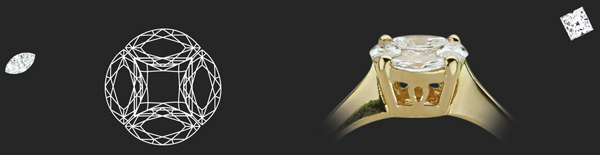 4 Marquis-Steine angeordnet sind und damit wie ein großer, hochkarätiger Brillant aussehen: 5 Steine mit zusammen 0,50 Carat vermitteln mit einem Oberflächendurchmesser von 6,5 mm den Eindruck eines Rings mit einem einzelnen Stein von mehr als 1 Carat.