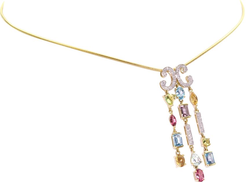 Der strahlend violette Amethyst aus Afrika, himmelblaue Topas aus Brasilien, hellblaue Aquamarin aus Sambia, olivgrüne Peridot aus Arizona, gelbe Citrin aus Madagaskar, rosa Turmalin aus Sri Lanka und der himbeerrote Granat aus Indien. Ein Feuerwerk aus Farben und Fantasie, wie aus den Schatztruhen eines Maharadschas.