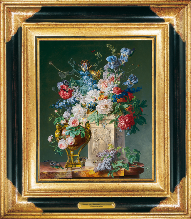 Gérardus van Spaendonck, geboren 1746 in Tilburg, vereinigt in seinem Werk „Corbeille de fleurs“ die technische Perfektion der holländischen und flämischen Stillebenmalerei mit der französischen Gabe für die Komposition anspruchsvoller, raffinierter Arrangements. Sein Vater, Hofmeister des Prinzen von Hessen-Kassel auf seiner herrschaftlichen Domäne in Tilburg, vermittelte ihm in den weitläufigen, im französischen Stil angelegten Gärten schon als Kind die Begeisterung für die Schönheit der Botanik. Von 1764 bis 1769 war er Schüler des Stillebenmalers Herryns in Antwerpen, woraufhin er nach Paris ging. 1774 wurde er der persönliche Miniaturenmaler des gerade gekrönten König Louis XVI. 1780 wurde er Professor für Malerei in den Ateliers der botanischen Gärten von Paris, wo auch der später berühmte Maler Redouté zu seinen Schülern gehörte.